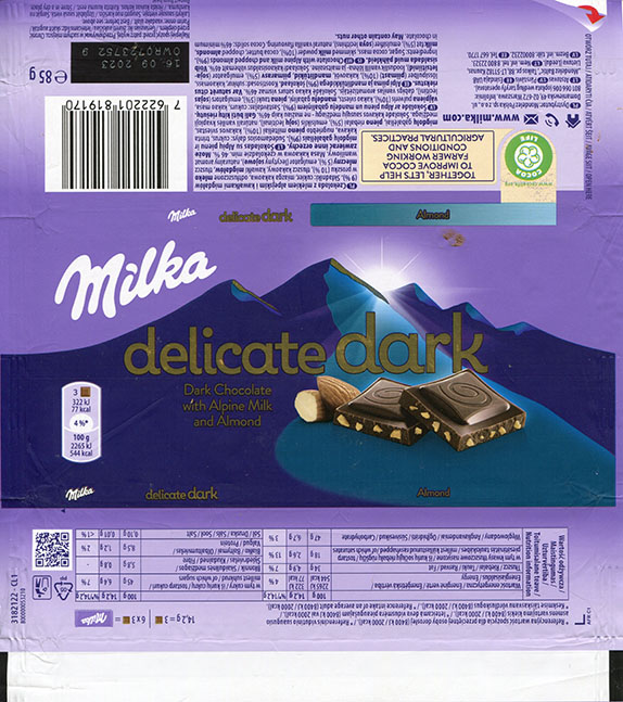 | Additional info about this wrapper: | Milka, Delicate dark, chocolate with Alpine milk and chopped almonds, 85g, 16.09.2023, Mondelez Polska Production sp.z.o.o., Warszawa, Poland |
