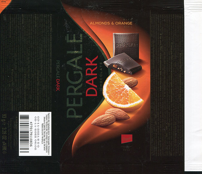 Dark chocolate Pergale with with chopped carameizedalmonds and orange pieces, 93g, 03.11.2021, Vilniaus Pergale AB, Vilnius, Lithuania
