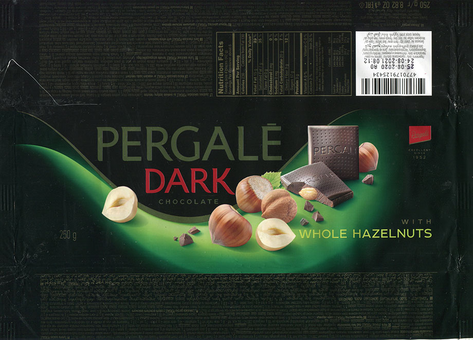 Dark chocolate Pergale with whole hazelnuts, 250g, 25.08.2020, Vilniaus Pergale AB, Vilnius, Lithuania