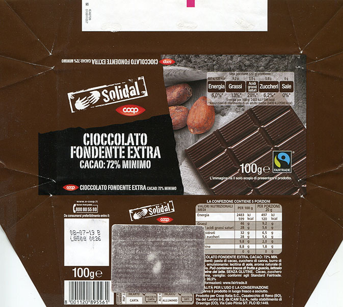 Extra dark chocolate, minimum 72% cocoa, 100g, 08.07.2018, manufactured by ICAM S.p.A., Orsenigo (CO), Italy, for Coop Italia S.C.