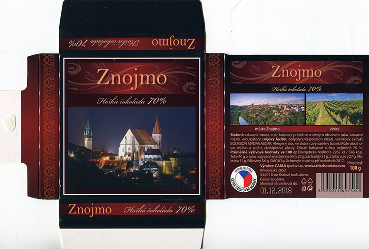 | Additional info about this wrapper: | Znojmo, dark chocolate 70%, 100g, 01.12.2017, CARLA spol. s.r.o., Dvur Kralove nad Labem, Czech Republic |