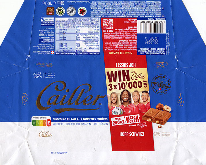 | Additional info about this wrapper: | Milk chocolate with whole hazelnuts, 100g, 03.2023, Cailler, Brok, Switzerland |