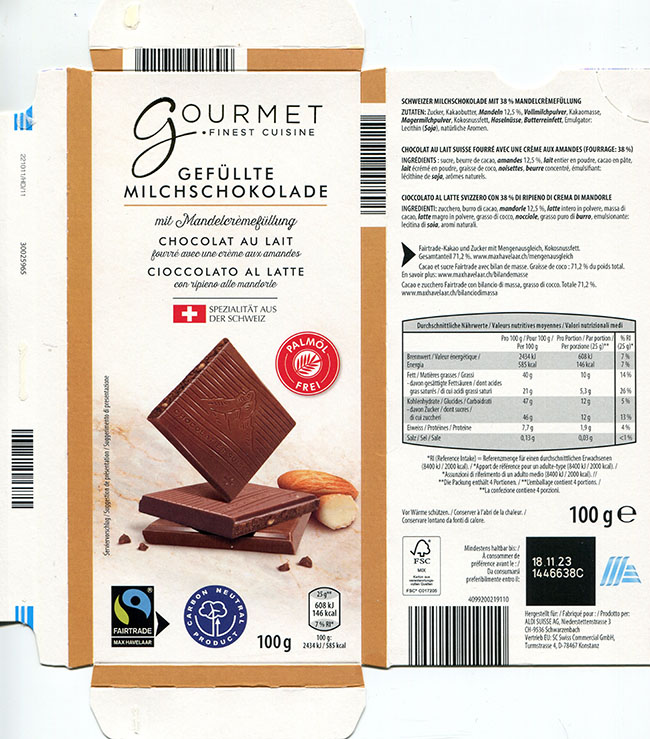 | Additional info about this wrapper: | Gourmet, Finest Cuisine, Swiss milk chocolate with 38% almond cream filling, 100g, 18.11.2022, Aldi Suisse AG, Schwarzenbach, Switzerland |