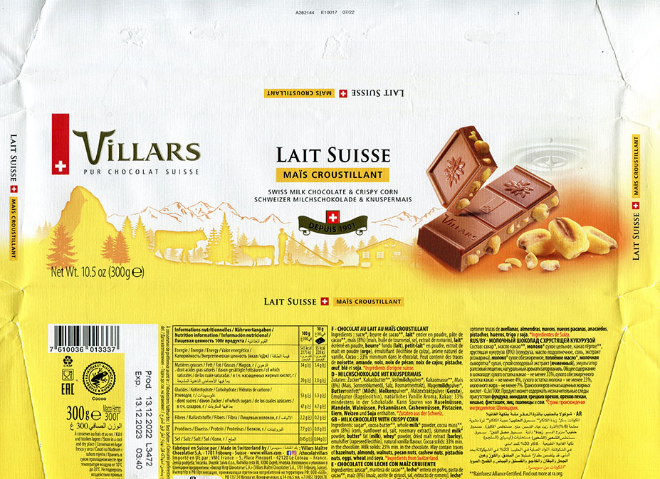 | Additional info about this wrapper: | Milk chocoalte with crispy corn, 300g, 13.12.2022, Villars Maitre Chocolatier S.A., Fribourg, Switzerland |