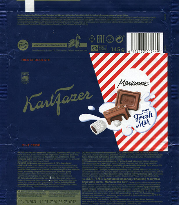 KarlFazer, Marianne, milk chocolate with peppermint crush, 145g, 10.10.2023, Fazer Confectionery, Helsinki, Finland