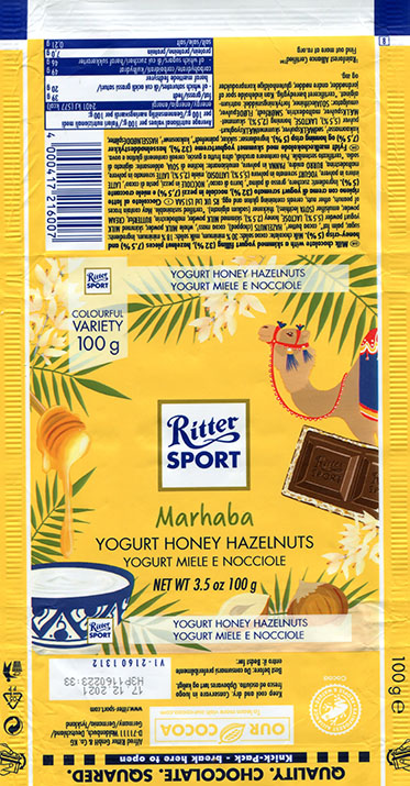 Ritter sport, Marhaba, milk chocolate with a skimmed yogurt filling, hazelnut pieces and honey-crisp, 100g, 17.12.2020, Alfred Ritter GmbH & Co.KG, Waldenbuch, Germany