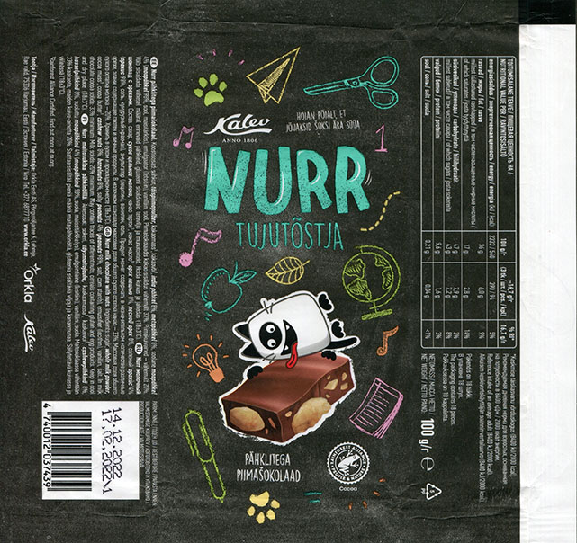 Kalev, Nurr, a mood-lifter, milk chocolate with nuts, 100g, 17.02.2022, Orkla Eesti AS, Lehmja, Estonia