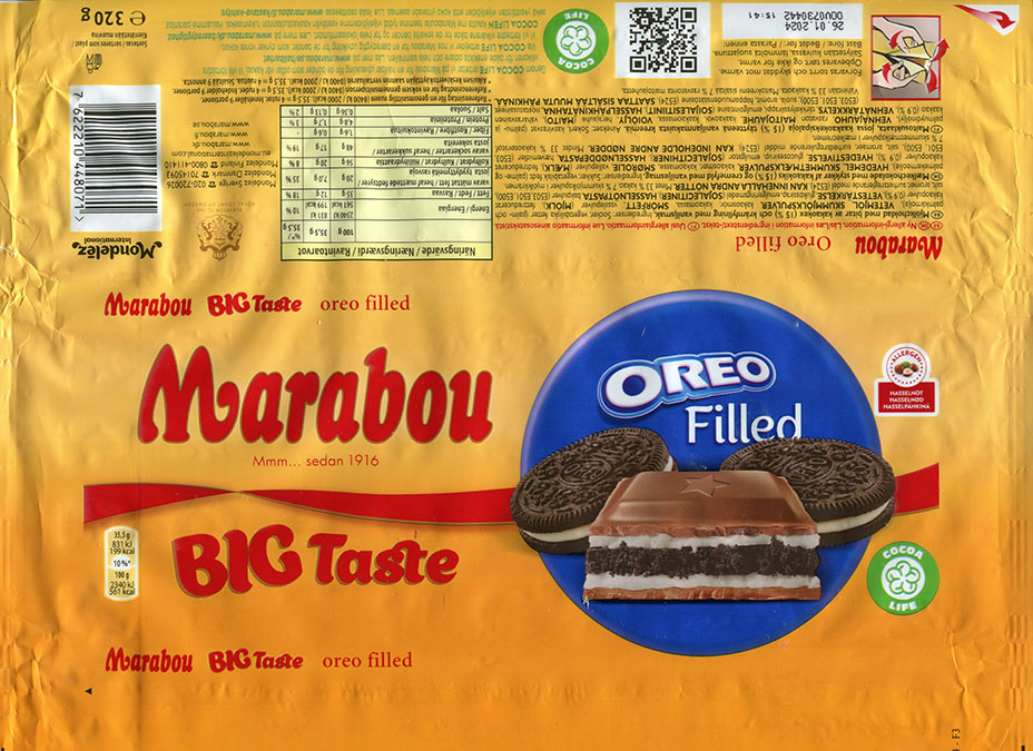 | Additional info about this wrapper: | Marabou, Big Taste, milk chocolate with pieces of cocoa biscuit and a vanilla-flavoured cream filling, 320g, 26.01.2023, Mondelez International (Sverige), Upplands Vasby, Sweden |