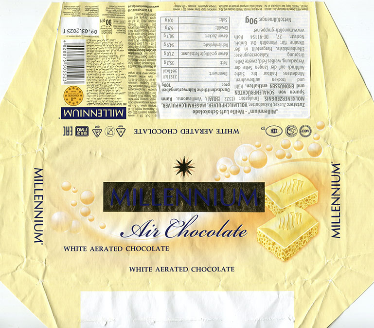 | Additional info about this wrapper: | Millenium, aerated white chocolate, 90g, 09.03.2024, Malbi Foods, Dnipro, Ukraine |