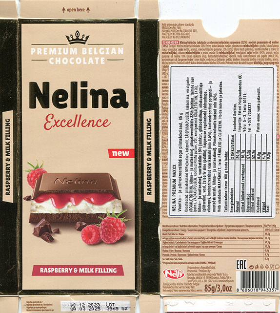 Premium chocolate, Nelina Excellence, milk chocolate with raspberry and buttermilk cream filling, 85g, 30.12.2023, Nelly d.o.o., Loznica, Serbia