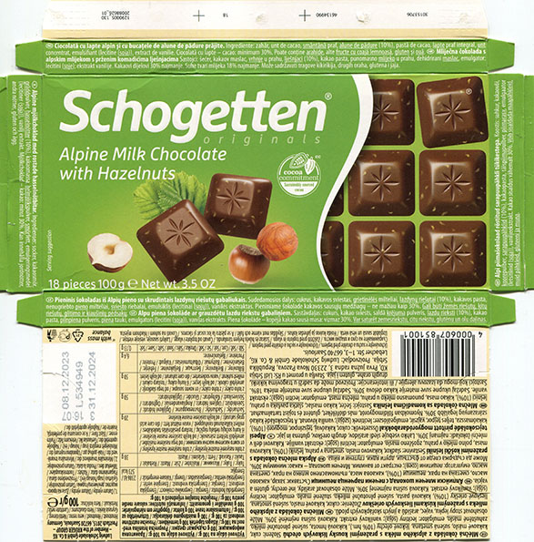 | Additional info about this wrapper: | Schogetten, Alpine milk chocolate with hazelnuts, 100g, 08.12.2023, Ludwig Schocolade GmbH&Co.KG, Saarlouis, Germany |