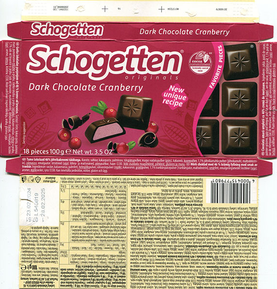 | Additional info about this wrapper: | Schogetten, dark chocolate with 46% cranberry cream filling, 100g, 23.02.2024, Ludwig Schocolade GmbH&Co.KG, Saarlouis, Germany |
