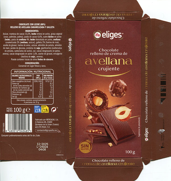 Milk chocolate, filled with caramelised hazelnut and biscuit, 100g, 12.2024, Ibercacao S.A., Toledo, Spain