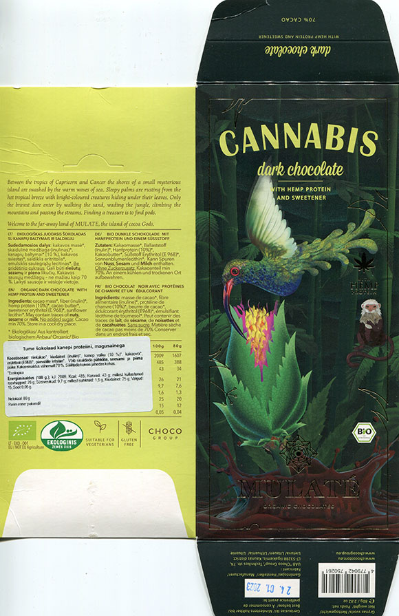 | Additional info about this wrapper: | Mulate, Organic dark chocolate with hemp protein and sweetener, 80g, 24.01.2022, UAB Choco Group, Ilgakiemio, Lithuania |
