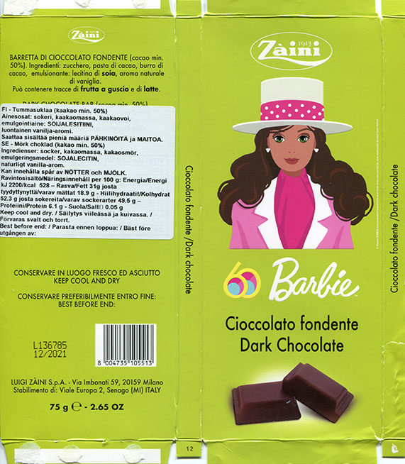 | Additional info about this wrapper: | Barbie 60, dark chocolate, 75g, 12.2020, Luigi Zaigi S.p.A., Senago (MI), Italy |
