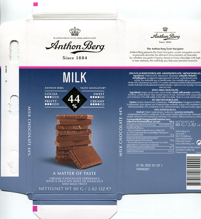 | Additional info about this wrapper: | Milk chocolate, 80g, 27.06.2021, Anthon Berg A/S, Ballerup, Denmark |