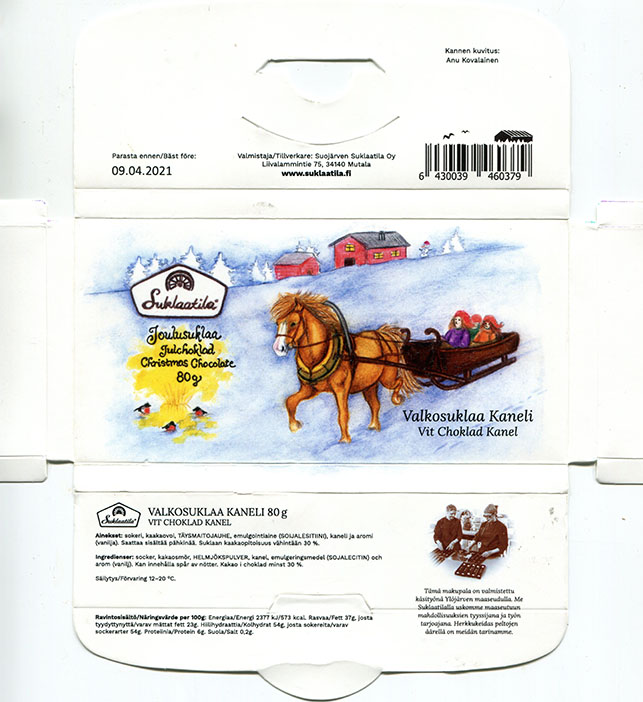 | Additional info about this wrapper: | Christmas chocolate, white chocolate cinnamon, 80g, 09.04.2020, Suojarven Suklaatila Oy, Mutala, Finland |