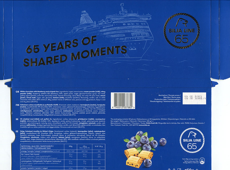 | Additional info about this wrapper: | 65 years of shared moments, Silja Line 65, white chocolate with blueberry and crisped rice, 300g, 09.05.2022, Kalev, Orkla Eesti AS, Lehmja, Estonia |