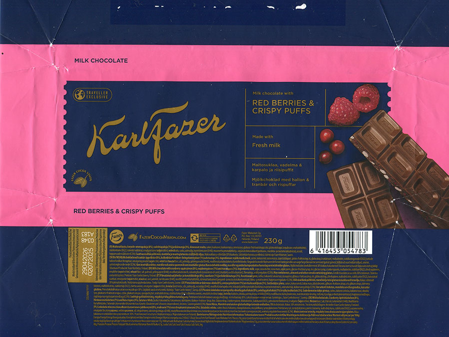 | Additional info about this wrapper: | KarlFazer, milk chocolate with cranberry-apple pieces, raspberry pieces and rice crispies, 230g, 02.07.2025, Fazer Makeiset OY, Helsinki, Finland |