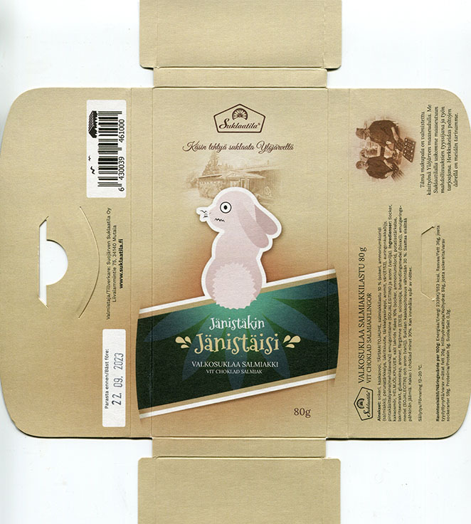 | Additional info about this wrapper: | Even a rabbit would get scared, white chocolate with salmiac flakes, 80g, 22.09.2022, Suojarven Suklaatila Oy, Mutala, Finland |