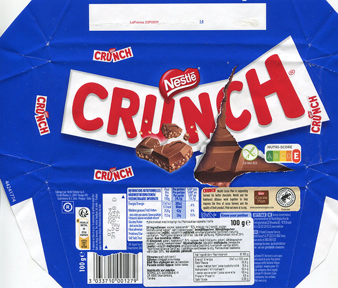 | Additional info about this wrapper: | Crunch, milk chocolate with crispy rice, 100g, 07.2023, Nestle Italiana S.p.A, Milano, Italy |