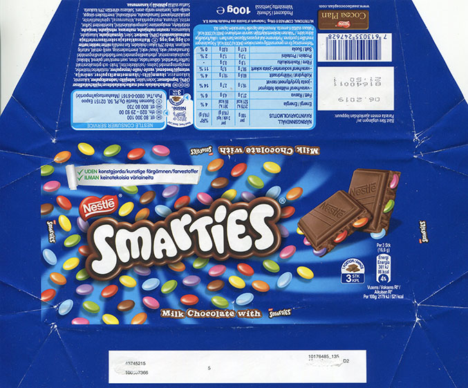 | Additional info about this wrapper: | Smarties, milk chocolate with sugar- coated milk chocolate pieces, 100g, 06.2018, Nestle Suisse S.A, Brok, Switzerland |