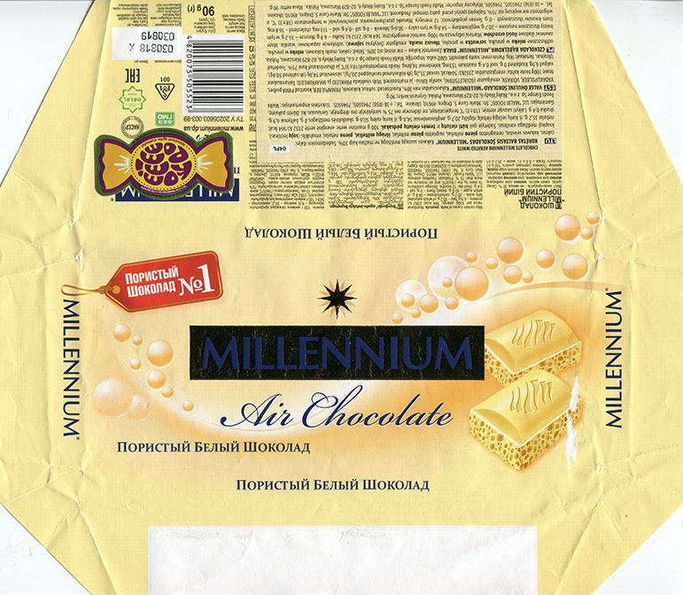 | Additional info about this wrapper: | Millenium, aerated white chocolate, 90g, 03.08.2018, Malbi Foods, Dnipro, Ukraine |