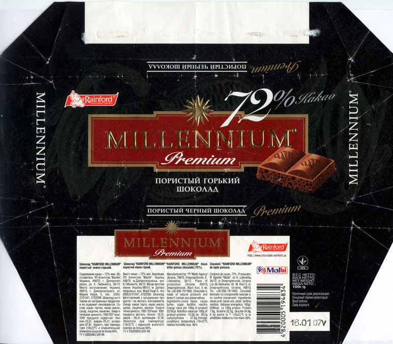 | Additional info about this wrapper: | Millenium Premium, dark bitter porous chocolate 72%, 100g, 16.01.2006, Rainford Ukraine, Dnepropetrovsk, Ukraine |