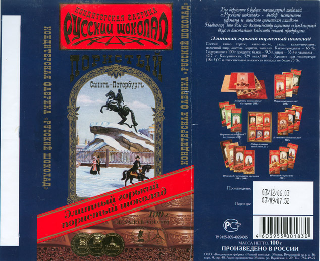| Additional info about this wrapper: | Dark air chocolate, 100g, 03.12.2006, Russkij shokolad, Moscow, Russia |