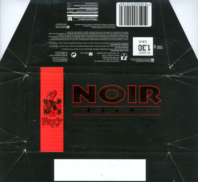 | Additional info about this wrapper: | Noir Special 72%, extra dark chocolate, 100g, 11.2000, Chocolat Frey AG, Buchs/Aargau , Switzerland |