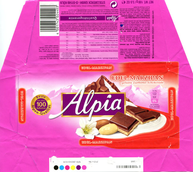 | Additional info about this wrapper: | Filled plain chocolate with marzipan filling, 100g, 2010, Stollwerck GMBH, Koln, Germany |