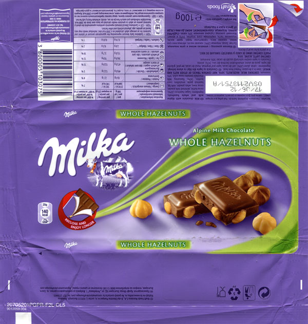 | Additional info about this wrapper: | Milka, milk chocolate with hazelnuts, 100g, 17.06.2011, Kraft Foods Romania S.A, Bucuresti, Romania |