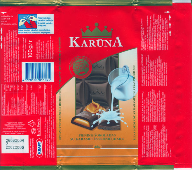 Additional info about this wrapper: | Karuna, milk chocolate with caramel, 100g, 26.08.2004 AB Krafts Foods , Kaunas, Lithuania |