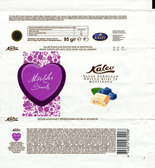 Moeldes Sinule, Kalev White chocolate with rice crisp and blueberry, 95g, 13.01.2011, AS Kalec Chocolate Factory, Lehmja, Estonia