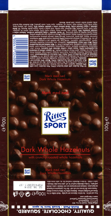 Ritter sport, plain chocolate with whole hazelnuts, 100g, 02.06.2013, Alfred Ritter GmbH & Co. Waldenbuch, Germany