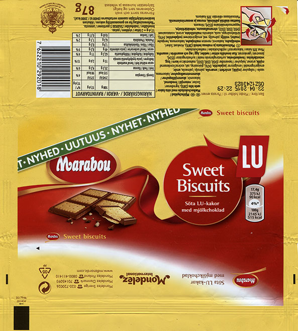 | Additional info about this wrapper: | Marabou, Sweet biscuits,milk chocolate with biscuits, 87g, 23.04.2014, Mondelez Sverige, Sweden |
