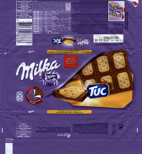 | Additional info about this wrapper: | Milka, milk chocolate with TUC cookies, 87g, 11.11.2012, Kraft Foods Espana Commercial, S.L., Madrid, Spain |