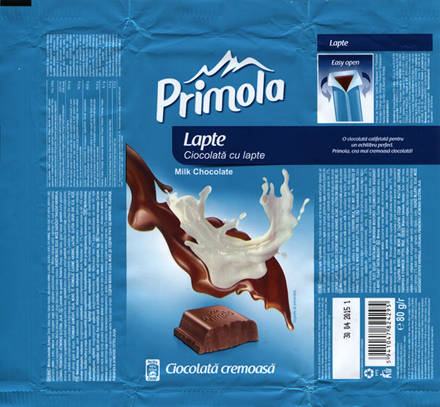 | Additional info about this wrapper: | Primola, milk chocolate, 80g, 30.04.2014, Kandia Dulce S.A, Bucharest, Romania |