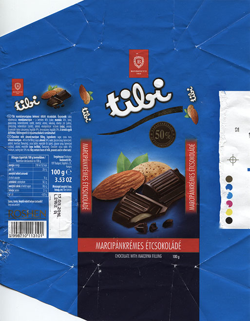 | Additional info about this wrapper: | Tili, chocolate with almond and marzipan filling, 100g, 17.03.2015, Bonbonetti Kft, Budapest, Hungary |
