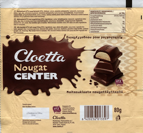 | Additional info about this wrapper: | Cloetta nougat center, milk chocolate with nougat filling, 80g, 15.08.2014, Cloetta Suomi Oy, Turku, Finland |