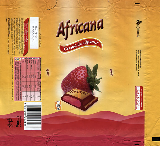 | Additional info about this wrapper: | Africana, milk chocolate with strawberry cream filling, 100g, 07.03.2012, Kraft Foods Romania S.A, Bucuresti, Romania |