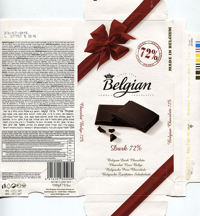 | Additional info about this wrapper: | Belgian dark chocolate, 100g, 23.07.2014, The Belgian Chocolate Group, Olen, Belgium |