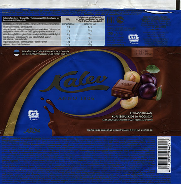 Kalev Anno 1806, milk chocolate wih bscu pieces and plum, 100g, 16.06.2015, AS Kalev, Lehmja, Estonia