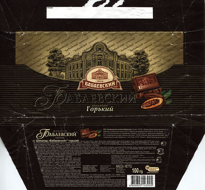 | Additional info about this wrapper: | Dark chocolate, 100g, 12.09.2016 ?, Babaevsky Confectionary Concern OAO, Moscow, Russia |