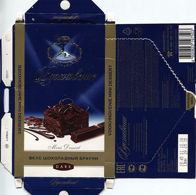 | Additional info about this wrapper: | Bitter chocolate with filling Vdohnovenie mini dessert chocolate brownie flavour, 100g, 01.10.2014, Babaevsky Confectionary Concern OAO, Moscow, Russia |