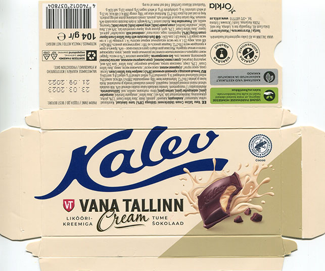 Kalev dark chocolate with Vana Tallinn Cream liqueur cream filling, 104g, 22.11.2022, Orkla Eesti AS, Lehmja, Estonia