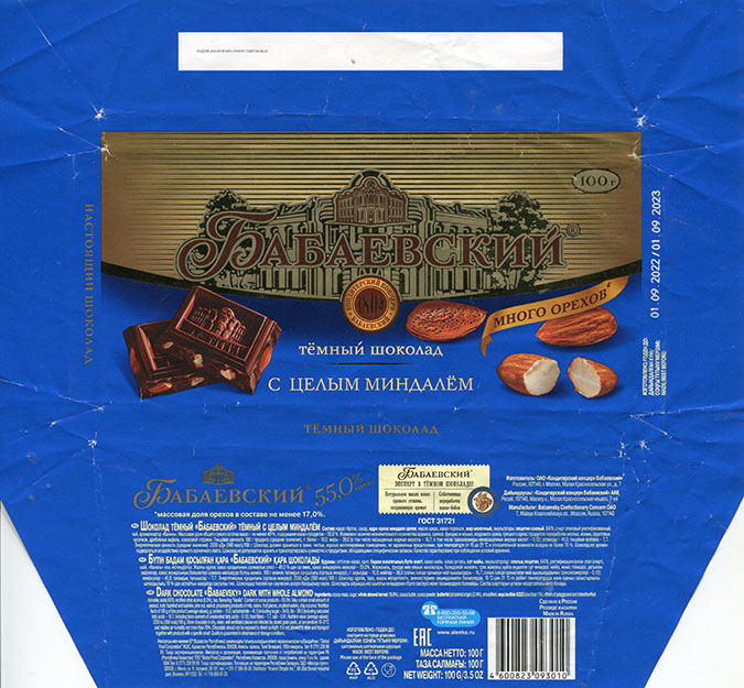 | Additional info about this wrapper: | Dark chocolate with whole almonds, 100g, 01.09.2022, Babaevsky Confectionary Concern OAO, Moscow, Russia |