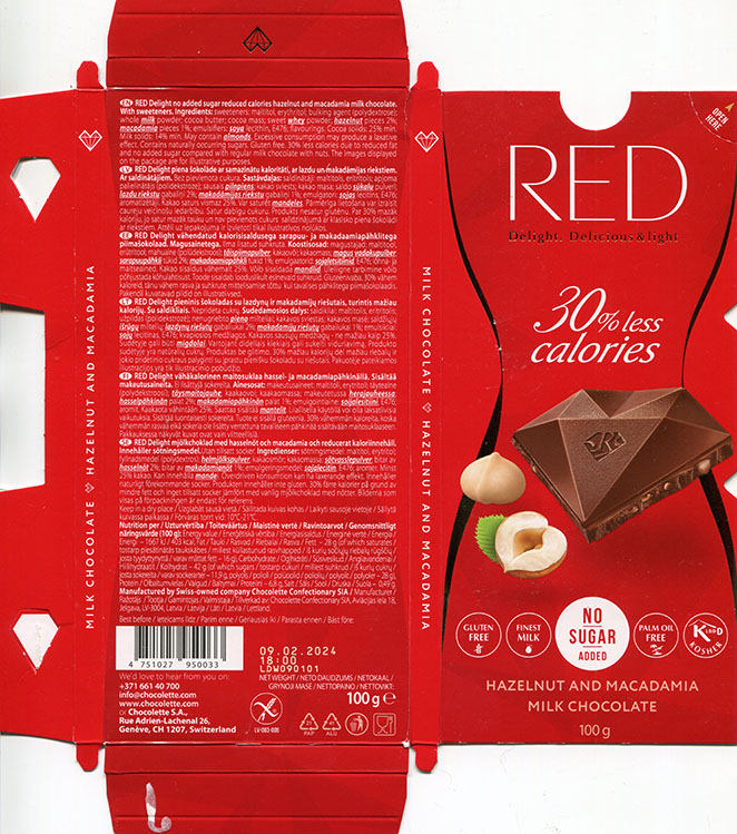 | Additional info about this wrapper: | RED, delight no added sugar reduced calories hazelnut and macadamia milk chocolate, 100g, 09.02.2023, Chocolette S.A., Geneve, Switzerland |