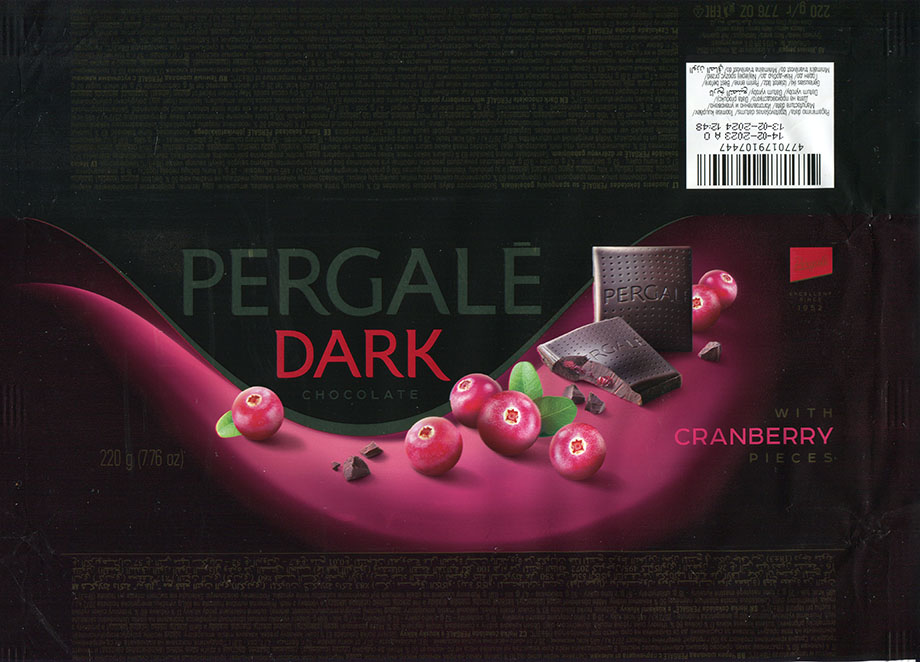 Dark chocolate Pergale with cranberry pieces, 220g, 14.02.2023, Vilniaus Pergale AB, Vilnius, Lithuania