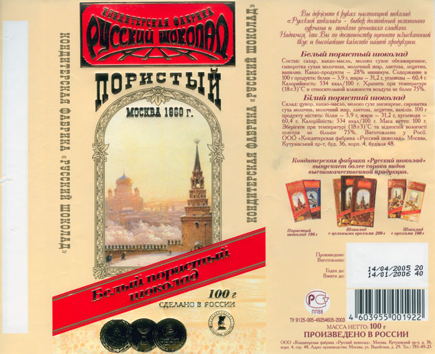 | Additional info about this wrapper: | White air chocolate , 100g, 14.04.2005, Russkij shokolad, Moscow, Russia |